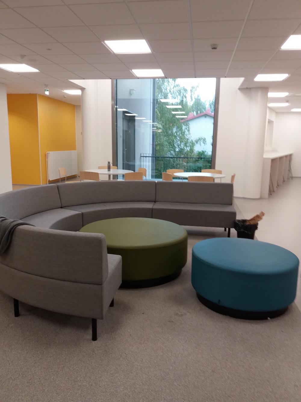 Uusi opettajainhuone oli valoisa ja viihtyisä.