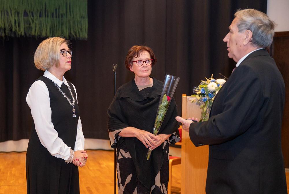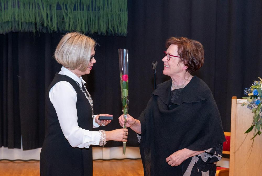 Ahti Ojanen ojensi Maarit Kuikalle Äänekoski-korun kiitoksena. Arja-Leena Peiponen ojensi ruusun. Kuva Leena Aijasaho