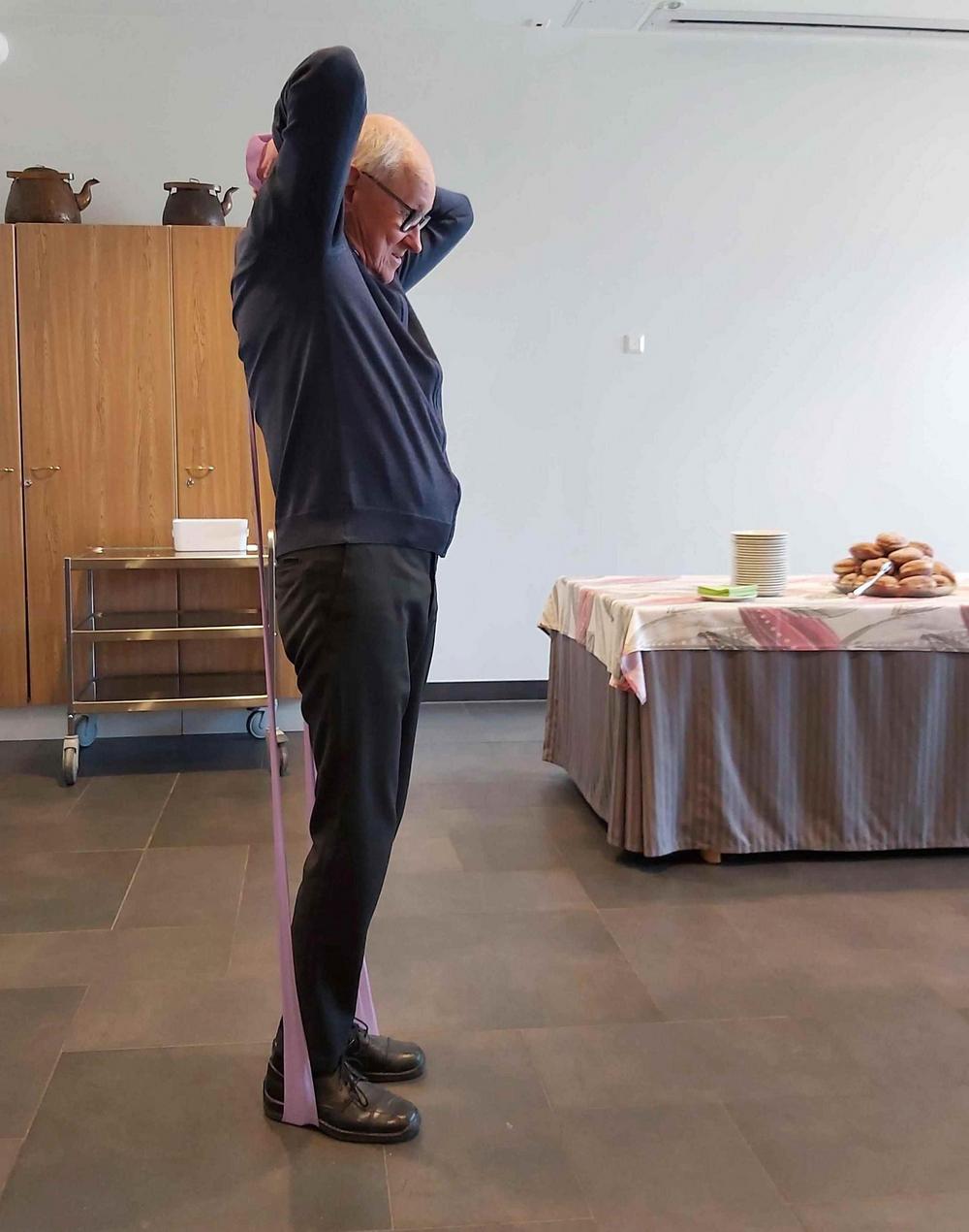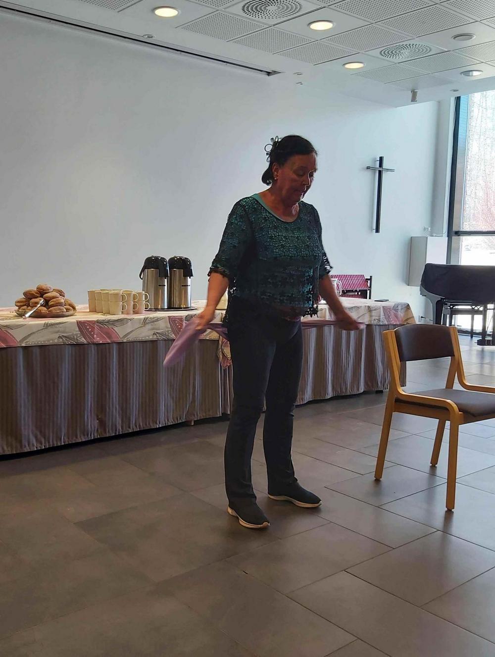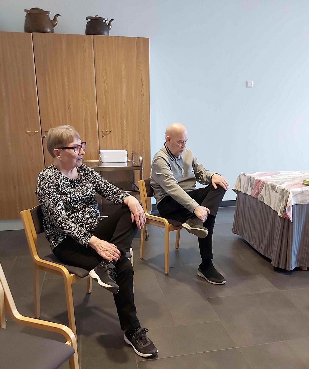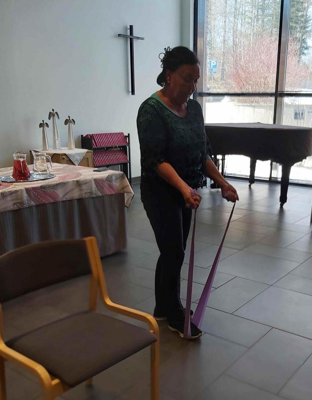 Anita Minkkinen tutustutti meidät Seniorijumppaan. Saimme osallistua keppi- ja tuolijumppaan. Kuminauhajumppaa esitteli Anitan kanssa puheenjohtajamme Jorma.