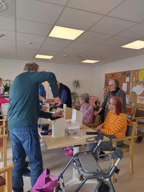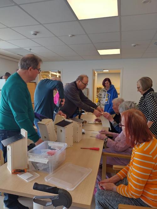 Kävimme maanantaina 28.4. 2025 avustamassa Eerolanrannan palvelutalon asukkaita linnunpönttöjen loppuvalmisteluissa.